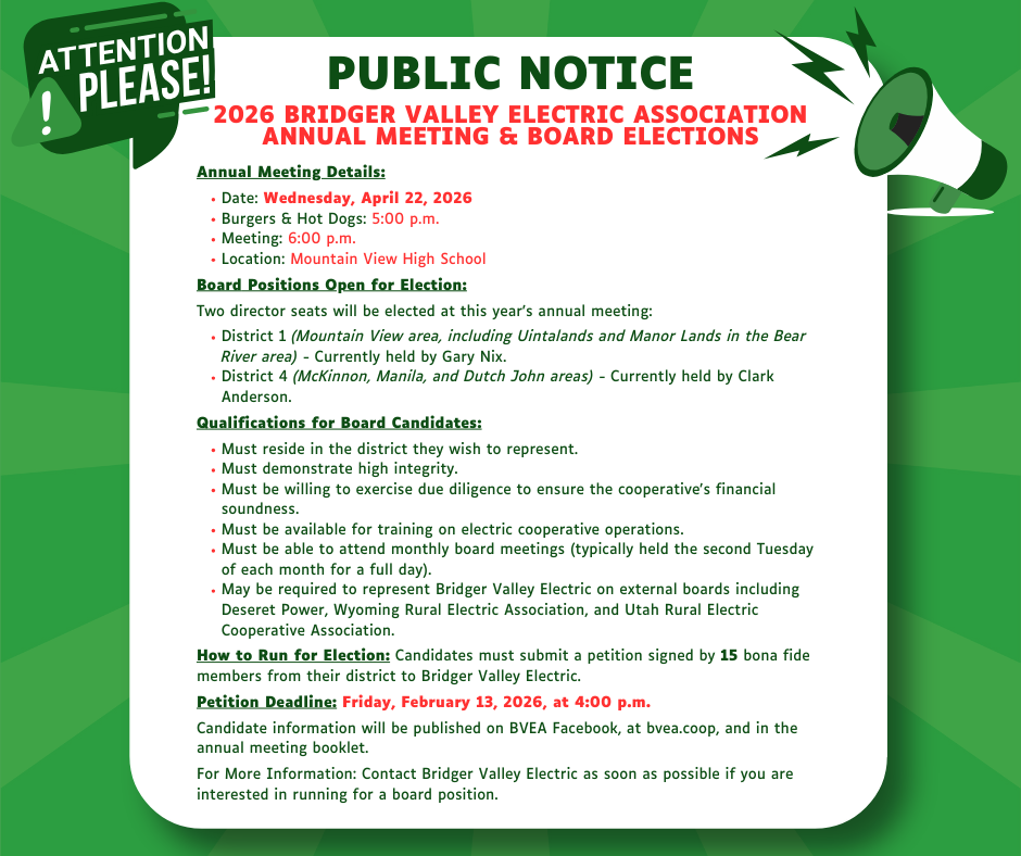 Bridger Valley Electric Association, Your Local Energy Partner, is one of Wyoming's consumer-owned Cooperatives.